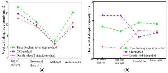 As shown in Figure 13, it is evident that the three-benching seven-step method results in the highest vertical displacement at the arch top position and the greatest horizontal displacement at the arch waist position. In comparison, the double-sided drift method exhibits superior performance in controlling the displacement of the perimeter rock. This enhanced control is attributed to the construction sequences of the double-sided drift method, where temporary support is strategically added to effectively inhibit the deformation of the surrounding rock. For both the double-sided drift method and the CRD method, horizontal displacements predominantly occur at the bottom footing location. Conversely, the three-benching seven-step method exhibits significant relative displacements at both sides of the arch waist position. Consequently, when implementing the three-benching seven-step method, it is crucial to employ reinforced support measures at the arch waist location to minimize deformation and ensure structural stability during excavation.