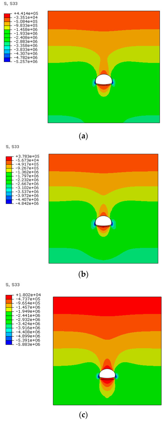 Surrounding rock stress maps under three working methods. (a) Double-sided drift method; (b) CRD method; (c) three-benching seven-step method.