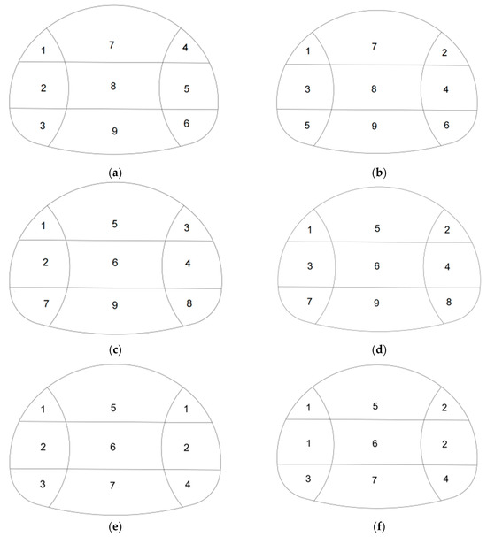 Working sequence arrangement. (a) Sequence I; (b) Sequence II; (c) Sequence III; (d) Sequence IV; (e) Sequence V; (f) Sequence VI.