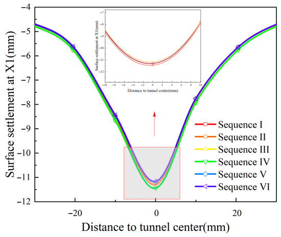 The surface settlement results illustrate the surface disturbance caused by the construction of different sequences in super-large cross-section tunnels. There is a documented correlation between the amount of surface settlement and the distance from the center of the tunnel, as detailed in Figure 16. At monitoring point X1, the trends of cumulative settlement changes under the six sequences are fundamentally similar. Owing to the symmetrical distribution of the tunnel along the central axis, the surface settlement exhibits a symmetrical concave pattern. Further analysis indicates that Sequence IV experiences the most pronounced overall cumulative settlement and the widest sinkhole. This is closely followed by Sequences III and II, with the trends for Sequences III and IV largely coinciding. Sequences V and VI show comparable levels of cumulative surface settlement, and their sinkhole warpage magnitudes are virtually identical. Notably, Sequence VI results in the least cumulative settlement of the surrounding rock. The values of settlement at the arch bottom and arch rise are crucial for assessing the stability of mega-section highway tunnels as they provide accurate reflections of the vertical displacements at the top and bottom of the arch.