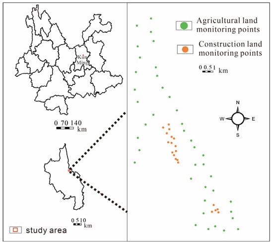 Based on the sewage discharge of enterprises in the industrial park, the distribution of sensitive points within a certain range in the surrounding area, the original use function of the land parcels, the characteristics of contamination, the soil monitoring network in the industrial park, and the surrounding area were constructed. One hundred samples of differently utilized land surface soil (0–20 cm) were collected; 60 samples were from construction land and 40 from agricultural land. To accurately determine whether the soil was polluted, the pollutant type, and the degree of pollution, sampling points were designed by combining professional judgment and systematic random distribution (Figure 1).