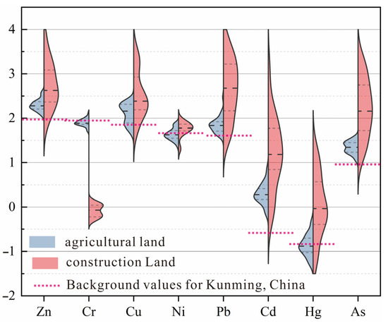 The coefficients of variation (Cv) [29] of As, Hg, Cd, Pb, Cu, and Zn in construction land were all >1, which is an anomalously strong variation, indicating that they are greatly influenced by human activities. Cd content was significantly higher than the background value in Kunming [30]. The Cv values of the contents of Hg, Cd, and Pb contents in the agricultural soils were >0.5, which also indicated strong variation. Relative to the background values in Kunming and the contents of the upper crust [31], the study area was significantly enriched in Cd (1023.89 times). All elements exceeded the background values in the agricultural land in Kunming, except for Cr (the data were logarithmically (In) treated to observe subtle changes in heavy metal(loid) content data in a more subtle manner considering that the data differed too much) (Figure 2).
