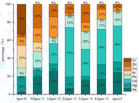 The Igeo results revealed slight contamination with all heavy metal(loid)s, except for Cr (Figure 3). The contaminated samples, relative to the total number of samples, were in the following order Cd > As > Zn > Cu = Pb > Hg > Ni > Cr.