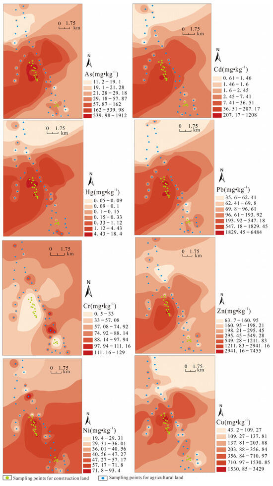 Soil samples were collected in strict accordance with the China Soil Environmental Quality Risk Control Standards for Soil Pollution of Agricultural Land (GB15618-2018) [19], Soil Environmental Quality Risk Control Standards for Soil Pollution of Construction Land (GB36600-2018) [20], Technical Specification for Soil Environmental Monitoring (HJ/T166-2004) [21], Determination of eight Effective State Elements in Soil (HJ804-2016) [22], and other relevant technical specifications. The samples were prepared using non-metallic tools and utensils to remove impurities such as plant roots and gravel (at least 2 kg per portion), packed in cloth bags, dried naturally, crushed with a wooden stick, passed through a 2 mm aperture sieve, mixed and weighed, and then sent to the laboratory for analysis. Sample testing was performed at the Testing Center of the China Inspection Body and Laboratory Mandatory Approved by the qualified Kunming Geological Survey Institute of the General Administration of Metallurgical Geology of China. The sample testing process adopted national-level standard substances (GBW series) for quality control. Each batch of the analytical process involved quality control measurements of parallel double samples. Eight elements (As, Pb, Cu, Zn, Cd, Hg, Ni, and Cr) were detected. The Cr content was determined using flame atomic absorption spectroscopy. The As and Hg contents were determined using atomic fluorescence spectrometry. Cd, Pb, Ni, and Cu contents were determined by inductively coupled plasma mass spectrometry. Zn content was determined using inductively coupled plasma emission spectrometry. Finally, pH was determined using a potentiometric method.