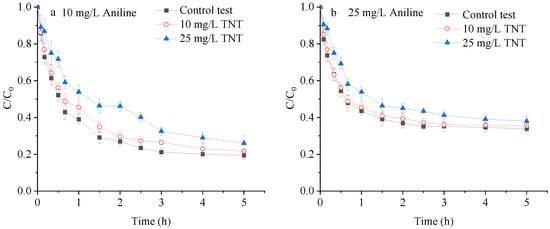 Effect of TNT on aniline adsorption on Chinese loess. (a) 10.0 mg/L aniline concentration; (b) 25.0 mg/L aniline concentration.