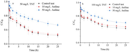 Effect of aniline on TNT adsorption on Chinese loess. (a,b) are for 50.0 and 100.0 mg/L TNT concentrations, respectively.