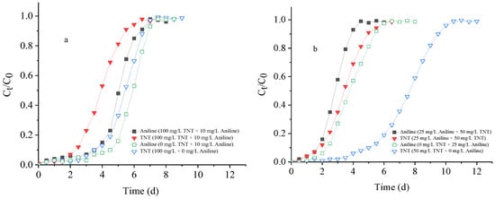 TNT and aniline breakthrough curves of column tests under individual and coexisting conditions. (a,b) are for 10.0 mg/L aniline and 100.0 mg/L TNT, 25.0 mg/L aniline and 50.0 mg/L TNT, respectively.