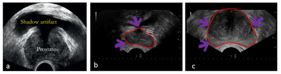 Example TRUS images in (a) with shadow artifacts in yellow arrows: adapted from Anas et al. (2018) [20], with permission from Elsevier, and in (b,c) with missing/blurry boundaries in purple arrows: adapted from Hassan et al. (2022) [40], with permission from Elsevier.