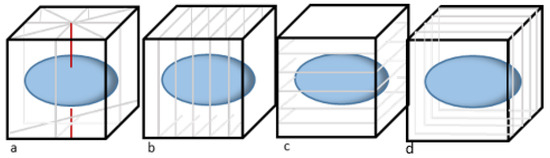 Orlando et al. (2020) [32] proposed a novel 3D segmentation method by utilizing a modified U-Net to segment twelve 2D radial slices, which were subsequently used for 3D volume reconstruction. The choice to obtain radial prostate segmentations, as opposed to transverse segmentations, was motivated by the observation that the prostate presents more clearly when the center of the gland is in-plane. Figure 4 illustrates the difference between radial, sagittal, and axial image slices. A modified U-Net was trained on 6773 2D images obtained randomly from axial, coronal, sagittal, and radial planes. The resulting 12 segmentations were placed in the initial 3D space, and the 3D prostate boundary was reconstructed. The resulting 3D segmentation was compared to a traditional V-Net, and the modified U-Net showed improved segmentation performance (DSC = 0.94 vs. 0.91). Although the V-Net was not rigorously optimized, this comparison suggests that segmentation based on 3D information can yield better results than less spatially dense image information.
