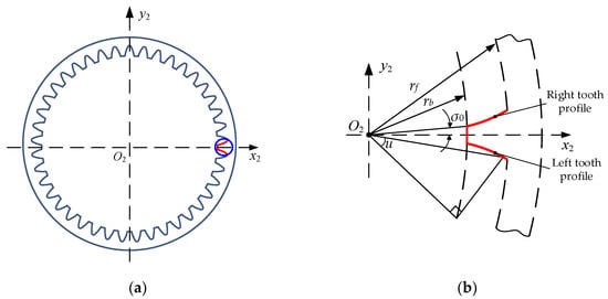 rb is the base circle radius of the internal helical gear, rf is the dedendum circle radius of the internal helical gear, u means the involute expansion angle, and σ0 means the angle between the line connecting the starting position of the involute and the origin with the x2 axis.