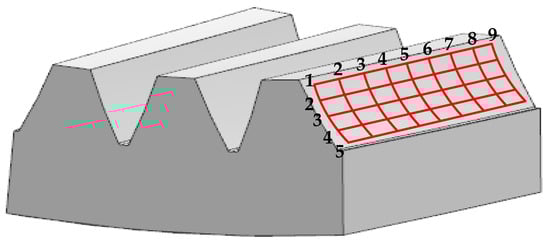 To calculate more accurately the profile curves of the drum-shaped grinding tool, the tooth surface of the internal helical gear is discretized by dividing into nine columns and five rows in the tooth length and tooth height directions, respectively, as described in Figure 2.