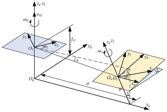 As shown in Figure 4, Sw(Ow-xwywzw) represents the coordinate system at the transverse face of the drum-shaped grinding tool, and it can be moved along the axial direction, and Sg(Og-xgygzg) represents the fixed coordinate system. S1(O1-x1y1z1) and S2(O2-x2y2z2) rotate with the drum-shaped grinding tool and the internal helical gear, respectively. At the initial, the coordinate system S1 coincides with Sw, and S2 coincides with Sg, b′ is the tooth width at the transverse face of the drum-shaped tool, and a is the center distance from the drum-shaped grinding tool to the internal helical gear. z1 and z2 coincide with the rotational axes of the drum-shaped grinding tool and the internal helical gear, respectively, and the angle between the two axes is Σ. The drum-shaped grinding tool rotates around the z1 axis with angular velocity ω1, while the internal helical gear rotates around the z2 axis with angular velocity ω2 and moves along the z2 axis with velocity v02 (in actual processing, this motion is performed by the drum-shaped grinding tool). Δ means the horizontal distance from S1 to S2, which can be obtained as: