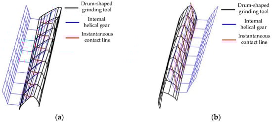 Tooth surfaces of drum-shaped grinding tool and internal helical gear: (a) left tooth surface; (b) right tooth surface.