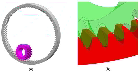 Assembly model of drum-shaped grinding tool and internal helical gear: (a) entire view; (b) enlarged view.