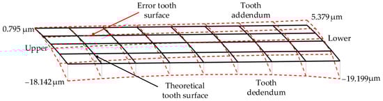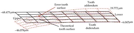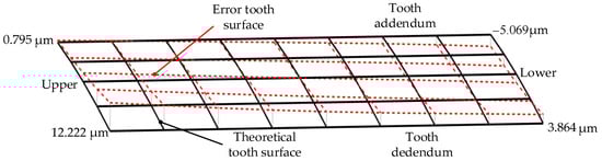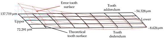 From Figure 9, it can be observed that the maximum normal deviation of the tooth surface caused by error B occurs at the tooth addendum on both the upper and lower transverse faces. At both the addendum and the tooth dedendum, the normal deviation decreases from the upper transverse face to the lower transverse face and then increases. Thus, normal deviation varies significantly along both the tooth height and width directions.
