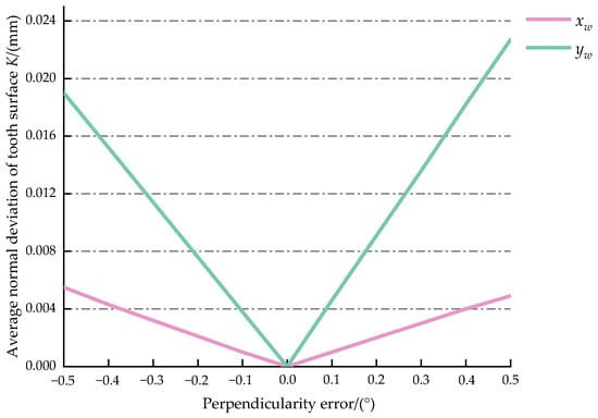 As depicted in Figure 14, the average normal deviation of the tooth surface caused by leaning around the yw axis is greater than that caused by leaning around the xw axis with the same perpendicularity error. Therefore, leaning around the yw axis is the sensitive direction of perpendicularity error. The average normal deviation of the tooth surface is linearly related to the perpendicularity.