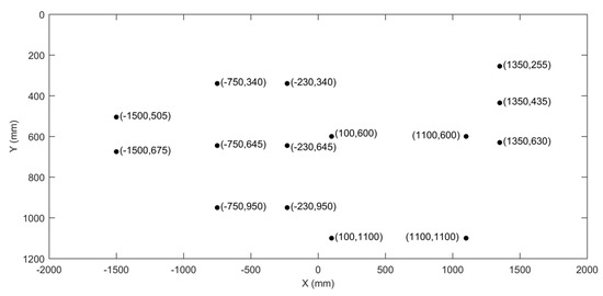 First, 15 static markers were positioned in the calibrated plane on pre-defined real coordinates, as presented in Figure 2. This trial was also simultaneously recorded using both cameras; the moving camera started the video at the position of approximately −2500 mm, and finished at approximately 2500 mm. The reconstruction errors of each camera were evaluated by the Euclidean distance from the real coordinates. As mentioned before, extrapolations beyond the calibrated area also increase the reconstruction error; therefore, the data from the moving camera were evaluated, considering the full field of view (F_FOV), and also subdivided into the coordinates evaluated at the horizontal center of the field of view (C_FOV) and the coordinates evaluated out of this zone based on a ±500 mm threshold from the center of the frame. Correlation between the estimated errors and the absolute horizontal pixel coordinate of the point were also evaluated. The F_FOV data from the moving camera were also compared with those the obtained using the static camera.