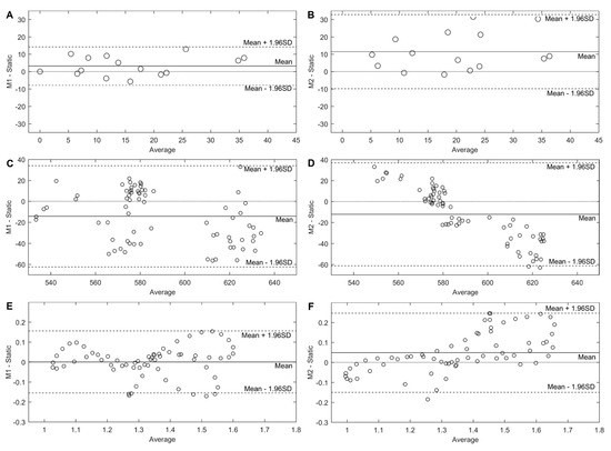 Bland–Altman plots. Panel (A): comparison between static camera and M1 for the static marker protocol 95% C.I. [−7.7, 14.2]. Panel (B): comparison between static camera and M2 for the static marker protocol 95% C.I. [−11.5, 34.3]. Panel (C): comparison between static camera and M1 for the rod protocol 95% C.I. [−64.2, 34.9]. Panel (D): comparison between static camera and M2 for the rod protocol 95% C.I. [−62.8, 37.8]. Panel (E): comparison between static camera and M1 for the swimming protocol 95% C.I. [−0.15, 0.15]. Panel (F): comparison between static camera and M2 for the swimming protocol 95% C.I. [−0.15, 0.23].