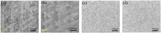 Figure 5a–d present the CLSM images of the M100 and M290 samples. The as-built M100 and M290 samples exhibit laser-melted tracks formed via an alternating 67° filling strategy. The widths of the tracks in the M100 and M290 samples are ~40–70 and 80–120 µm, respectively, corresponding to the hatching distances (which are related to the laser spot sizes). After heating, the laser-melted tracks are no longer observed, but the GBs are clearly observed.