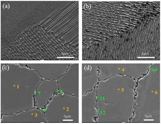 Figure 6a–d illustrate the SEM images of the M100 and M290 samples. The as-built samples display different layers, with several containing cellular dendrites and others featuring columnar structures due to the alternating 67° filling strategy. In contrast, the heated M100 and M290 samples exhibit columnar precipitates along their GBs, and the difference in the precipitate sizes of the two samples is negligible.
