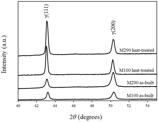 Figure 7 shows the XRD patterns of the M100 and M290 samples. The observed peaks correspond to the FCC γ-Co phase. As-built M290 exhibits a strong γ (200) orientation, indicating the presence of a {200}-texture.