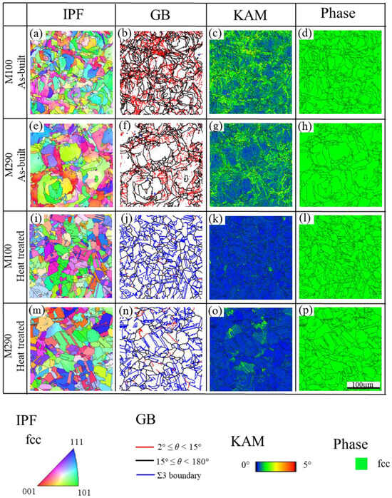 EBSD maps of as-built (a–d) M100, (e–h) M290 heated, (i–l) M100, and (m–p) M290. Samples: (a,e,i,m) IPFs, (b,f,j,n) GBs, (c,g,k,o) KAM maps, and (d,h,l,p) phases.