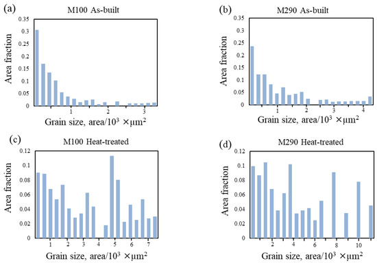 Grain-size distributions of as-built (a) M100 and (b) M290 and heated (c) M100 and (d) M290 samples.