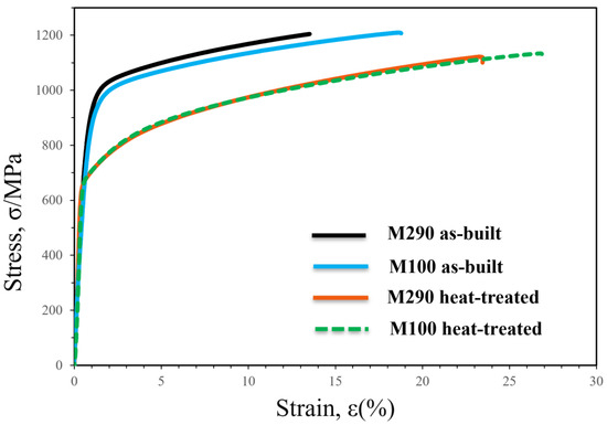 The results of the tensile studies are listed in Table 3, and the stress-strain curves of representative samples for each group are shown in Figure 10. In the as-built and heated states, the degrees of elongation of the M100 samples significantly exceed those of the M290 samples. Conversely, no significant differences in the 0.2% PS and UTSs of M100 and M290 are detected. After heating, the 0.2% PS and UTSs of both samples decrease, whereas their degrees of elongation increase.