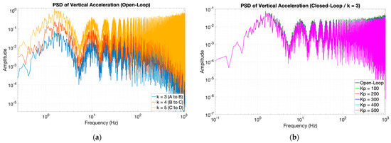 The transfer functions of the open-loop and closed-loop systems, shown in Equations (18) and (34), are used to determine the frequency responses in Figure 6. The figure compares the frequency responses for both systems and demonstrates that increasing results in a reduced amplitude response in the closed-loop system compared to the open-loop system. This indicates that the proportional ride-blending controller effectively reduces the vibration of the vehicle’s sprung mass.