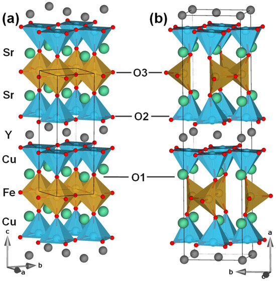 (a) Crystal structure of the ideal stoichiometric oxide YSr2Cu2FeO8 (S.G. P4/mmm, ICSD file 11514). The unit cell has dimensions of ap × ap × 3 ap, where ap refers to the cubic perovskite lattice parameter. (b) Crystal structure of the ideal stoichiometric oxide YSr2Cu2FeO7 (S.G. Ima2, Initial cell parameters and atomic positions were taken from ICSD record of YSr2Cu2GaO7.46, ICSD file 71263). Color code: Fe in brown, Cu in blue, Sr in green, Y in grey, and O in red.