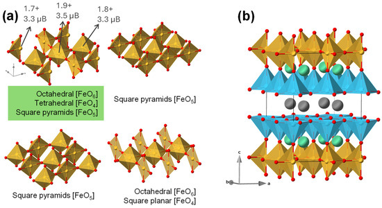 To model the YSr2FeCu2O7.5 phase, the four possible configurations in the 2ap × 2ap × 3ap supercell were generated (Figure 2a). Note that, despite the experimental suggestions from the neutron powder diffraction (NPD) results for the YSr2Cu2FeO7.56 phase [21], none of the four modelled configurations have Fe in solely tetrahedral [FeO4] and octahedral [FeO6] environments. The configuration where Fe forms tetrahedra (Th) [FeO4], octahedra (Oh) [FeO6], and square pyramids (SQP) [FeO5] (Figure 2a) is the most stable, with a maximum energy difference obtained from geometrical optimization with the SCAN functional of 300 meV/f.u. with respect to the less stable configuration (all Fe ions in SQP).