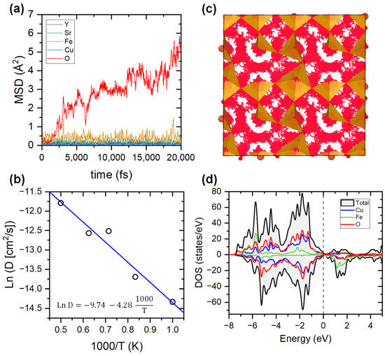 (a) MSD at 1400 K for the YSr2FeCu2O7.5 (b) Arrhenius plot of diffusion coefficients obtained at each simulated temperature for YSr2FeCu2O7.5. (c) Calculated trajectories for oxide ions in the FeO1.5 plane of YSr2FeCu2O7.5. Note that the diffusivity of oxygen (O3) takes place only in this plane. (d) Calculated atom projected DOS for the YSr2FeCu2O7.5.