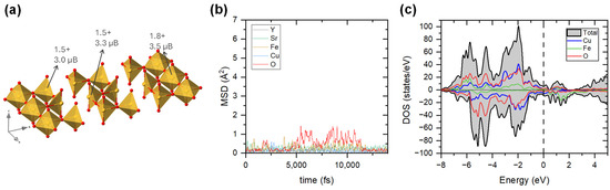 As for the electronic conductivity, the calculated DOS (Figure 3d) corroborates that the electronic charge density remains delocalized throughout the system. According to the calculated DOS, YSr2Cu2FeO7.5 is a semi-metallic compound (0 eV band gap). These results agree with the MIEC characteristics found in YSr2Cu2FeO7.56 by López et al. [21].