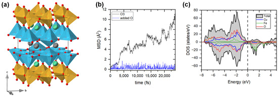 To verify that oxygen vacancies in the FeO1+δ plane are responsible for oxygen diffusion, a YSr2FeCu2O7.75 phase was investigated in which there is excess oxygen in the yttrium plane (Figure 5a). Note that the extra oxygen drives the coordination around some Cu ions from square pyramidal to octahedral. Although this configuration has not been experimentally observed in the YSFCO system, it is present in layered perovskite oxides GdBa(Mn, Co)2O5−x [40,41]. AIMD simulation performed at 1400 K reveals high oxygen mobility (calculated D (1400 K) = 7.62 × 10−6 cm2/s), similar to the AIMD value found for YSr2Cu2FeO7.5 (see Figure 3a). Notably, oxygen diffusion is anisotropic, occurring only in the FeO1+δ plane, while the oxygen added in the Y plane does not diffuse (Figure 5b). The calculated DOS for the YSr2FeCu2O7.75 phase indicates a metallic behavior, similarly to the δ = 0.2 and δ = 1 terms. These results endorse a good electronic conductivity in the YSCFO system.