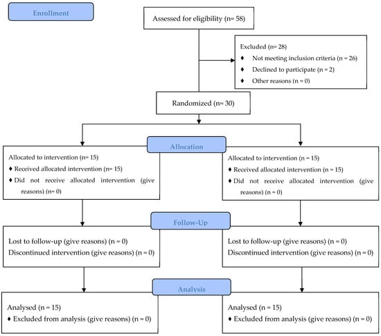 Recruitment for this study started on September 2021 and the last follow-up visit was carried out in June 2022. During the screening phase, 58 subjects were selected, but 30 participants were finally included in this study, 15 in each group. The reasons for excluding 28 subjects are listed in the study flow chart Figure 1.