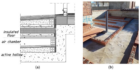 Constructive section of the active hollow core slab (a); construction photo of the active hollow core slab of a building under rehabilitation (b).