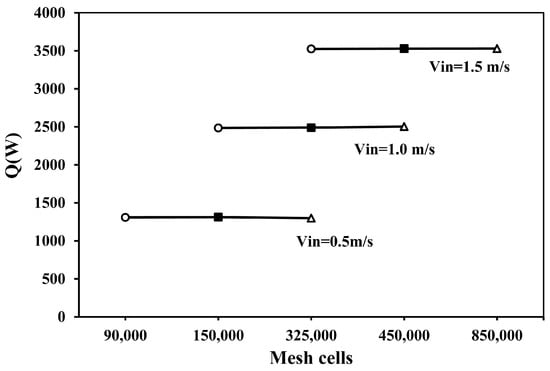 In Phase 1, all the geometries of the cases to be studied are generated, starting from the base geometry of case 0. After the geometry phase, the cases to be studied go to Meshing Phase 2; in this phase, a validation of the meshing is performed by comparing the results with 3 different meshes according to the GCI [33] method, choosing the mesh with the best computational accuracy–cost balance. The mesh used in the simulation is constructed from tetrahedral elements and increases in size from the walls towards the center of the air chamber. This type of mesh produces better convergence because there is a higher density of elements within the thermal boundary layer where the heat transfer coefficient is solved. To ensure the correct solution within the boundary layer, the nodes must be located within the viscous sublayer. Thus, the first element should be located at a maximum distance of 1 mm from the wall, and the growth rate towards the center of the enclosure should be between 10% and 15%. The parameter that controls the correct solution of the viscous sublayer is y+. In Figure 3, 3 meshes (coarse, medium, and fine) are compared as indicated by the GCI method where the () exchanged on the three meshes is monitored for 3 inlet velocities (0.5, 1.0, and 1.5 m/s). This figure shows that the medium mesh size provides better computational cost–accuracy.