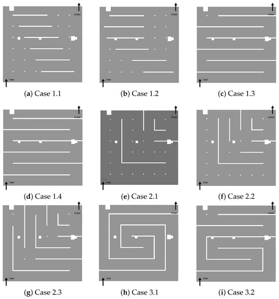 The methodology presented in this article has been applied to 9 different versions of air chamber and their corresponding airflows. Figure 5 shows these 9 cases deriving from 4 initial designs and their modifications. Thus, the first initial design, case 0 (Figure 2), has a free air chamber with no restrictions on the air passage between the inlet and outlet ports. From this initial design, the proposed modifications involve including restrictions on the airflow from the inlet to the outlet. In this way, 3 initial designs and some modifications to them are proposed. The design of Case 1 consists of placing partitions parallel to the X axis of Figure 5, so that airflow is restricted in the direction of the Y axis. Two such cases, 1.1 and 1.2, were studied in which the air can circulate with greater or lesser restriction on the left and right of the partitions, and two other cases (1.3 and 1.4) in which the air moves in a zigzag manner. Case 2 aims to divide the airflow into 2 parts, one in the direction of each X and Y axis. Three variants of this configuration have been studied, 2.1, 2.2 and 2.3, which progressively increase the restrictions to the airflow. The final configuration studied, Case 3, circulates the air following a spiral geometry and consists of two variants, 3.1 and 3.2. Specifically, in configuration 3.1, the air flows, first, counterclockwise and then clockwise, while configuration 3.2 is initially a counterclockwise spiral and then becomes a zigzag configuration.