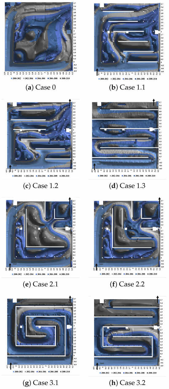 Different cases under study: CFD maps of air temperature Case 0 (a), Case 1.1 (b), Case 1.2 (c), Case 1.3 (d), Case 2.1 (e), Case 2.2 (f), Case 3.1 (g), and Case 3.2 (h).