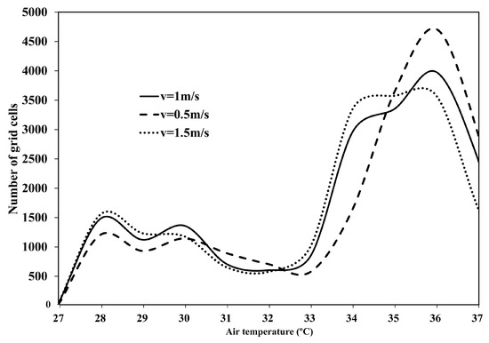 Both the mean temperature and the air temperature distribution depend on the air velocity. Figure 8 compares the results for 0.5, 1, and 1.5 m/s in the inlet section for Case 3.2. The results show that the lower the temperature, the more skewed to the right the temperature frequency distribution, and therefore, the higher the average air temperature in the air chamber. Although increasing the inlet air velocity from 0.5 to 1 m/s slightly reduces the mean air temperature, increasing it from 1 to 1.5 m/s has little effect on it.