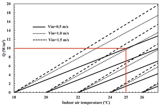 The results for the best performance case for the different space temperatures and air inlet temperatures and mass flow rates are shown in Figure 14. The figure shows the heat removed from the space on the ordinate axis and the air temperature of the interior space to be conditioned on the abscissa axis for the five different inlet air temperatures and the three air velocities considered. As can be seen in the figure, for a given temperature of the space to be conditioned, the greater the heat removed, the higher the mass flow rate and the lower the inlet air temperature. The usefulness of this analysis and this figure is that it can be interpreted as an operating map of the system. For example, let us suppose that the thermal load of the space where the system is installed has been calculated to be 10 W/m2, and that the set-point temperature of this space (with which this thermal load has been calculated) is 25 °C. Then, according to this figure, we could cover this thermal load with a system in which the air inlet temperature is 18 °C and the inlet velocity is 0.5 m/s, or if the temperature of the supply air is 20 °C, the inlet velocity is 1 m/s.