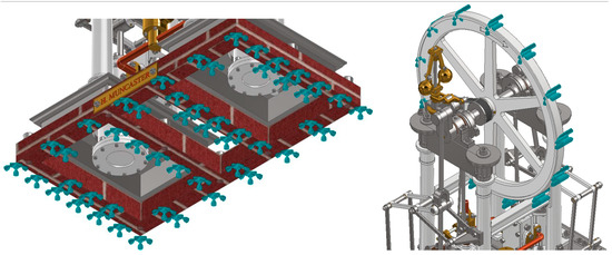 Constraints have been applied to limit the movement of the six degrees of freedom on the bottom face of the brick base and the flywheel (Figure 6). For the bottom surface of the base (Figure 6, left), all translations and rotations have been restricted to accurately simulate the connection between the base and another solid or the ground. Regarding the flywheel (Figure 6, right), the external surface has been constrained to simulate critical conditions, such as the flywheel being locked at the start of the machine’s operation, as well as all its degrees of freedom, since this is the only way to transmit torque to the engine. Therefore, in both cases, translations in all directions and rotations around the local reference system axis of each solid have been restricted.