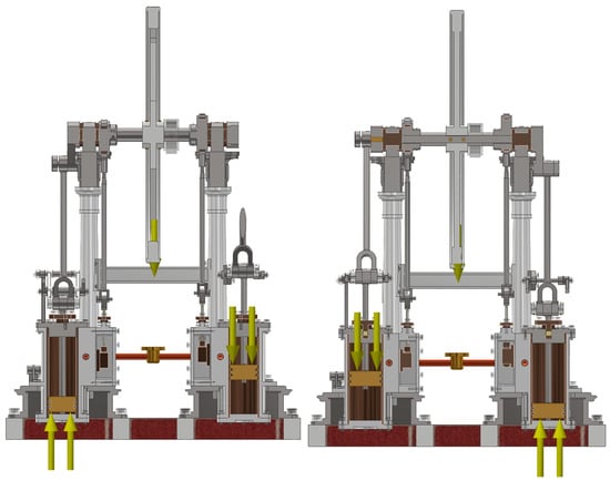 As previously mentioned, the same amount of steam enters each piston at the same pressure, resulting in the same load, although the resulting values differ for each position and cylinder. While one piston compresses or expands the steam, the other is mid-stroke, meaning that steam expands on one side of the piston and exhausts to atmospheric pressure on the other. This condition will be verified at the upper and lower dead centers of each cylinder (Figure 8 and Figure 9) with the applied pressure load, also including the force of gravity.