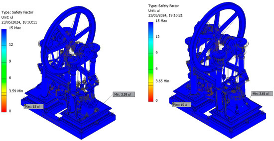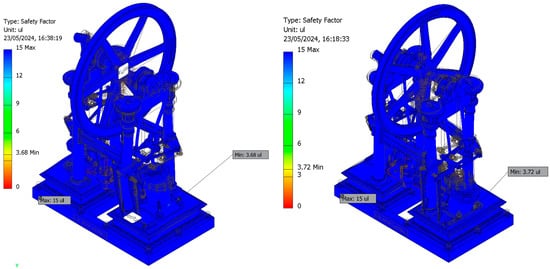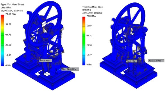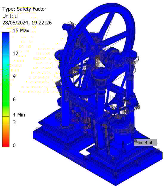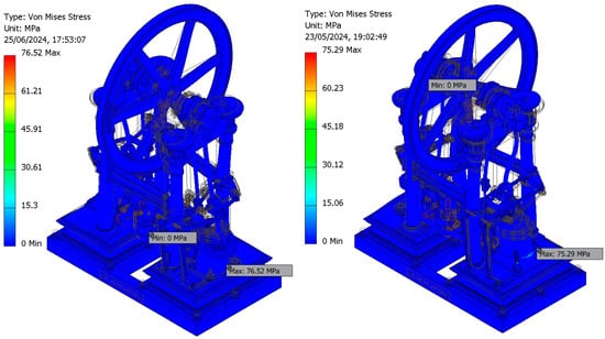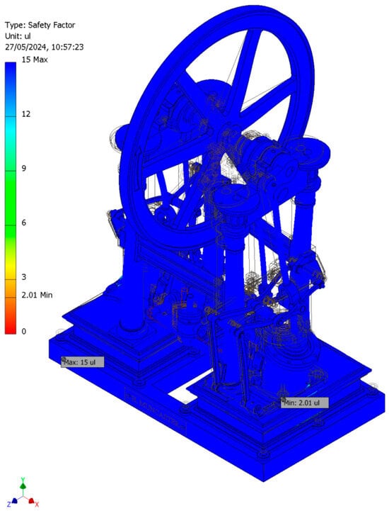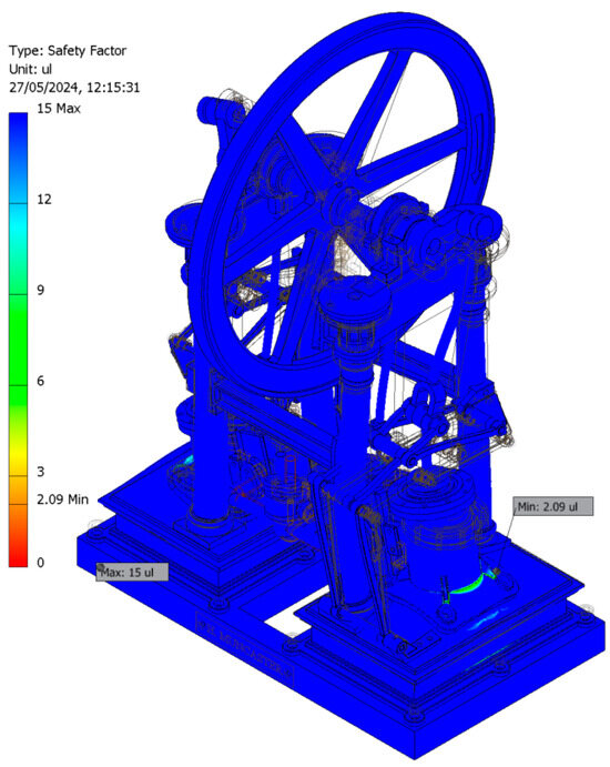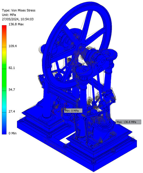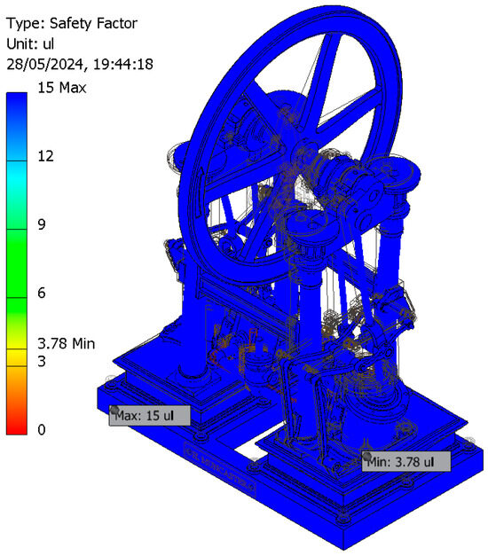 However, since no information regarding the operating conditions (working pressures) was available, it was necessary to determine the working pressure values (steam admission pressures) to ensure the safe operation of the engine from a materials strength perspective. This process established the optimal range of operating pressures to ensure its technical feasibility. The simulations were performed ensuring that the safety factor values were between two and four, which is considered to be the optimal range from the perspective of modern machine design.