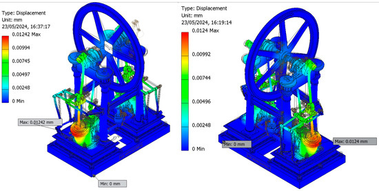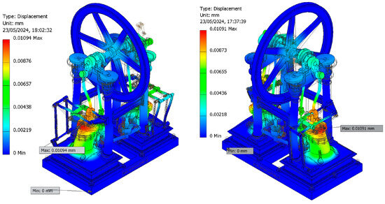 Our findings reveal that the peak von Mises stress is located at the lower dead center position of the left cylinder. For displacement analysis, a scaling factor of two was applied to better visualize the deformed configuration of the steam engine at both critical positions (lower and upper dead center of the left cylinder). This adjustment is consistent with the observation that maximum displacements occur in the left cylinder due to compression and tension forces acting within it. However, the displacements obtained are negligible, which supports the efficient operation of the steam engine under this pressure load. Moreover, the absence of significant deformations reduces friction between components.