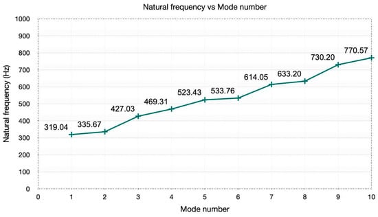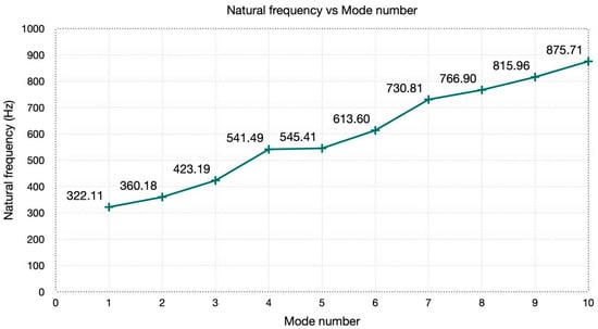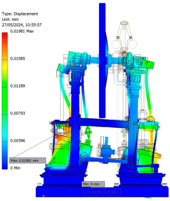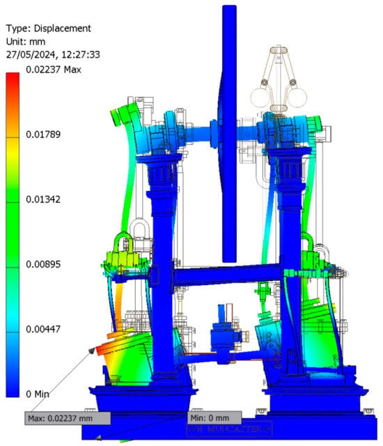Figure 26 depicts a diagram of the modal analysis performed for critical position 2, following a methodology analogous to that of critical position 1. It was confirmed that none of the natural frequencies were zero, indicating the suitability for conducting a linear static analysis. Under the simulation conditions, at the critical position associated with the piston plunger’s position at the lower dead center of the left cylinder, the behavior as a mechanism is ruled out.