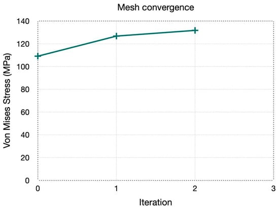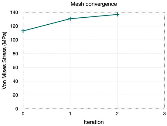 Similar to the analysis at the upper dead center position, the working pressure was set at 3.550 MPa. However, it was essential to verify all parameters, especially ensuring that the safety factor is greater than one. After performing the analysis with different mesh sizes, a mesh convergence analysis graph was obtained (Figure 27), along with detailed information on element size, von Mises stress, relative error (%), and the iteration number (Table 3).