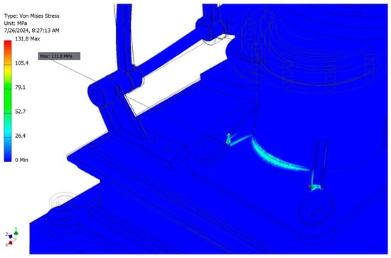 As a verification measure, the aforementioned pressure was also applied to the lower dead center position, confirming that the safety factor is below four (3.78) (Figure 34).