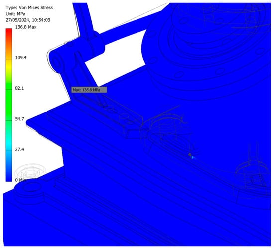 Figure 28 shows the distribution of von Mises stress, and Figure 29 indicates the location of the maximum stress value (136.8 MPa), specifically at the connecting rib between the right cylinder body and its base.