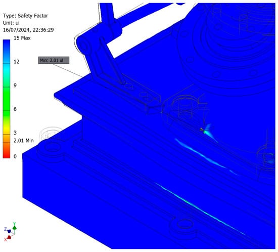 Ultimately, Figure 31 illustrates the distribution of the safety factor, while Figure 32 highlights the location of the minimum value (2.01), which is situated at the connecting rib between the right cylinder body and its base.